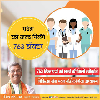 मुख्यमंत्री श्री त्रिवेन्द्र सिंह रावत के निर्देश पर राज्य में साधारण ग्रेड चिकित्साधिकारियों के 763 रिक्त पदों को भरने की प्रक्रिया प्रारम्भ कर दी गई है। उत्तराखण्ड प्रान्तीय चिकित्सा एवं स्वास्थ्य सेवा संवर्ग के तहत साधारण ग्रेड चिकित्साधिकारियों के रिक्त पदों को भरने के लिए शासन द्वारा उत्तराखण्ड चिकित्सा सेवा चयन बोर्ड को अध्याचन भेजा गया है। बोर्ड से रिक्त 763 पदों पर सीधी भर्ती के लिए तत्काल विज्ञप्ति प्रकाशित कर चयन की कार्यवाही प्राथमिकता से करने की अपेक्षा की गई है।