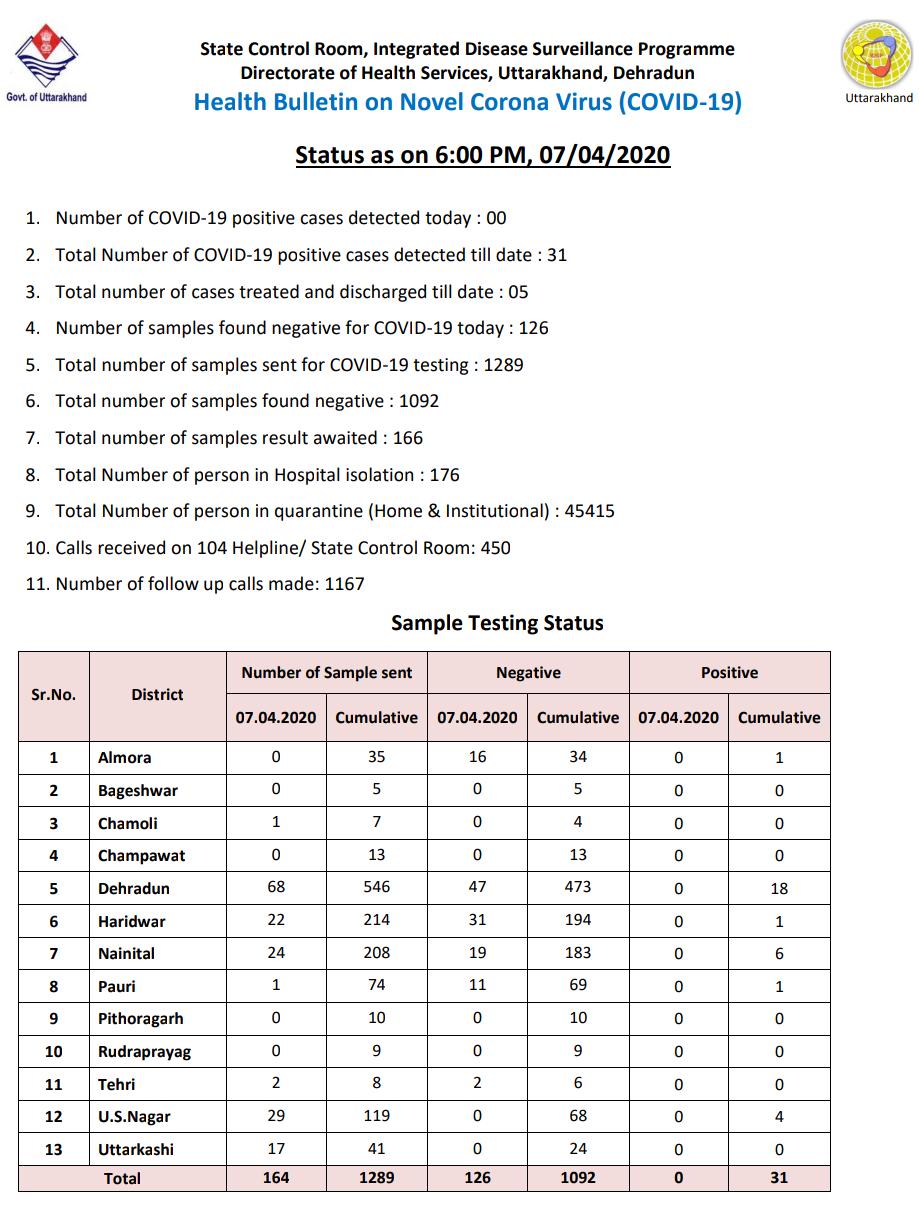 देहरादून-उत्तराखण्ड में कुछ दिनों से लगातार कोरोना के मामले जमातीयों की वजह से बढ़ते जा रहे हैं। जिससे उत्तराखंड में कोरोना के31 मरीज संक्रमित  पाए गए। लेकिन मंगलवार को स्वास्थ्य विभाग ने जारी किया गया हेल्थ बुलेटिन में उत्तराखंड में कोरोना से राहत देने वाला है।आज  किसी  भी  जिलेमें कोई कोरोना पॉजिटिव नहीं मिला यह सबको राहत देने वाली खबर है