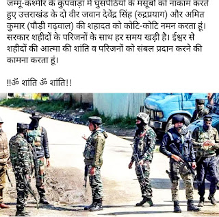 मुख्यमंत्री त्रिवेन्द्र सिंह रावत ने जम्मू-कश्मीर के कुपवाड़ा में घुसपैठियों के मंसूबों को नाकाम करते हुए उत्तराखंड के दो वीर जवान देवेंद्र सिंह (रुद्रप्रयाग) और अमित कुमार (पौड़ी गढ़वाल) की शहादत को नमन करते हुए ईश्वर से शहीदों की आत्मा की शांति व परिजनों को संबल प्रदान करने की कामना की है। उन्होंने कहा कि सरकार शहीदों के परिजनों के साथ हर समय खड़ी है।