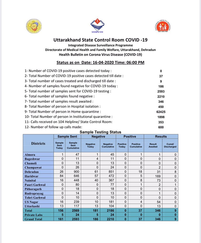 आज राज्य में कोरोना वायरस का कोई नया सामने नहीं आया है। राज्य में कोरोना वायरस पॉजिटिव मामलों की संख्या 37 है, इसमें डिस्चार्ज/ठीक हुए 9 मामले भी शामिल हैं: उत्तराखंड स्वास्थ्य विभाग