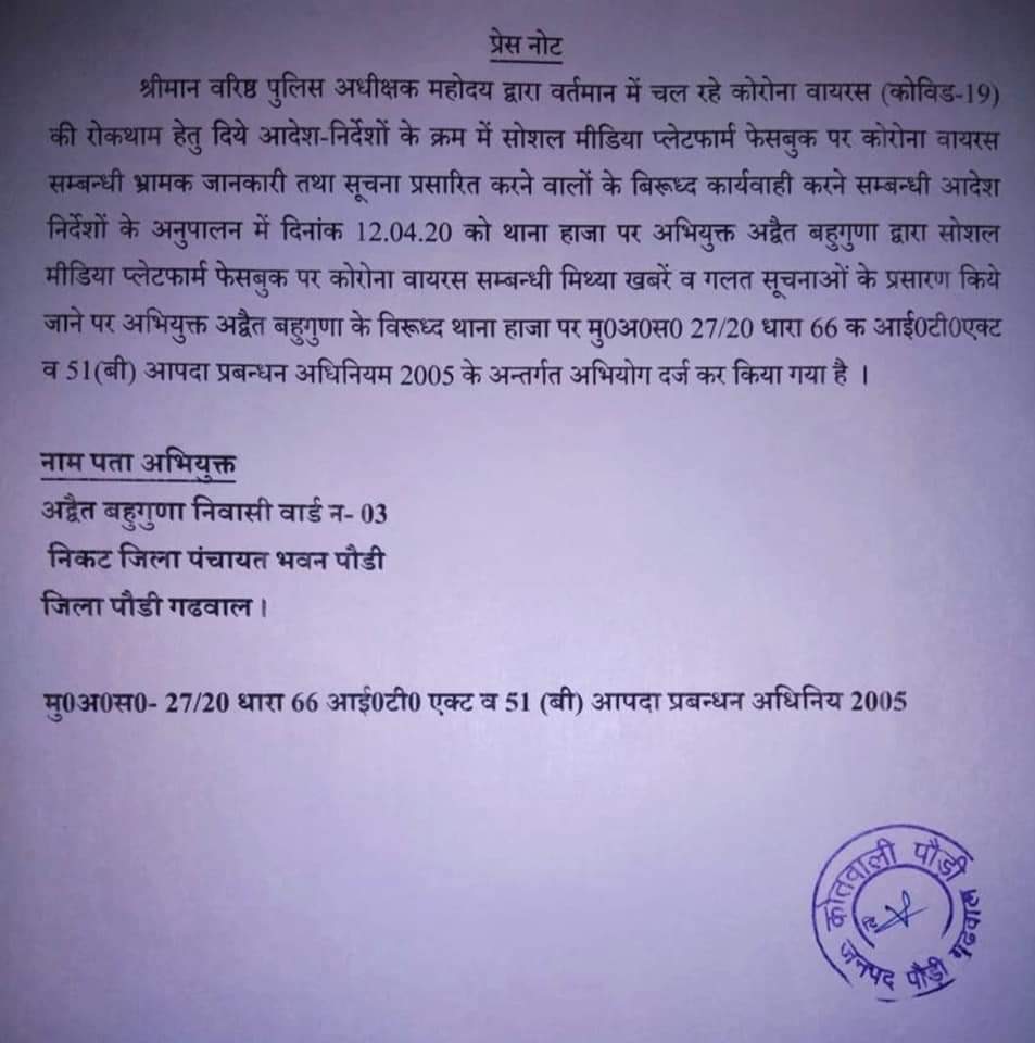 फेसबुक पर अपने व्यंग्यात्मक अंदाज़ में मोदी सरकार पर अकसर हमलावर पौड़ी के स्वतंत्र पत्रकार अद्वैत बहुगुणा भी माननीय सर्वोच्च न्यायालय द्वारा कोरोना वायरस के सम्बन्ध में भ्रामक पोस्ट डालने पर कानूनी कार्यवाही के निर्देशों के क्रम में आई टी एक्ट की धारा 66 “क”और आपदा प्रबन्धन अधिनियम 2005 की धारा 51 “बी” के चपेट में आ गये है,अद्वैत के ख़िलाफ़ थाना पौड़ी में अभियोग दर्ज किया गया है।