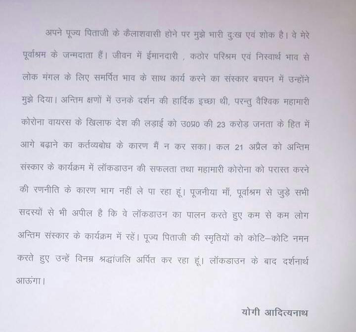 अंतिम क्षणों में पिताजी के दर्शन की हार्दिक इच्छा थी, परंतु वैश्विक महामारी कोरोना वायरस के खिलाफ देश की लड़ाई को उत्तर प्रदेश की 23 करोड़ जनता के हित में आगे बढ़ाने के कर्तव्यबोध के कारण मैं दर्शन न कर सका।