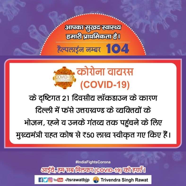 मुख्यमंत्री  त्रिवेंद्र सिंह रावत ने कोरोना वायरस के दृष्टिगत दिनांक 14 अप्रैल, 2020 तक हुए लॉक डाउन के कारण दिल्ली में फंसे उत्तराखण्ड के व्यक्तियों  के भोजन, रहने व उनके गंतव्य तक पहुंचने के लिए मुख्यमंत्री राहत कोष से ₹ 50 लाख स्वीकृत किए हैं।
