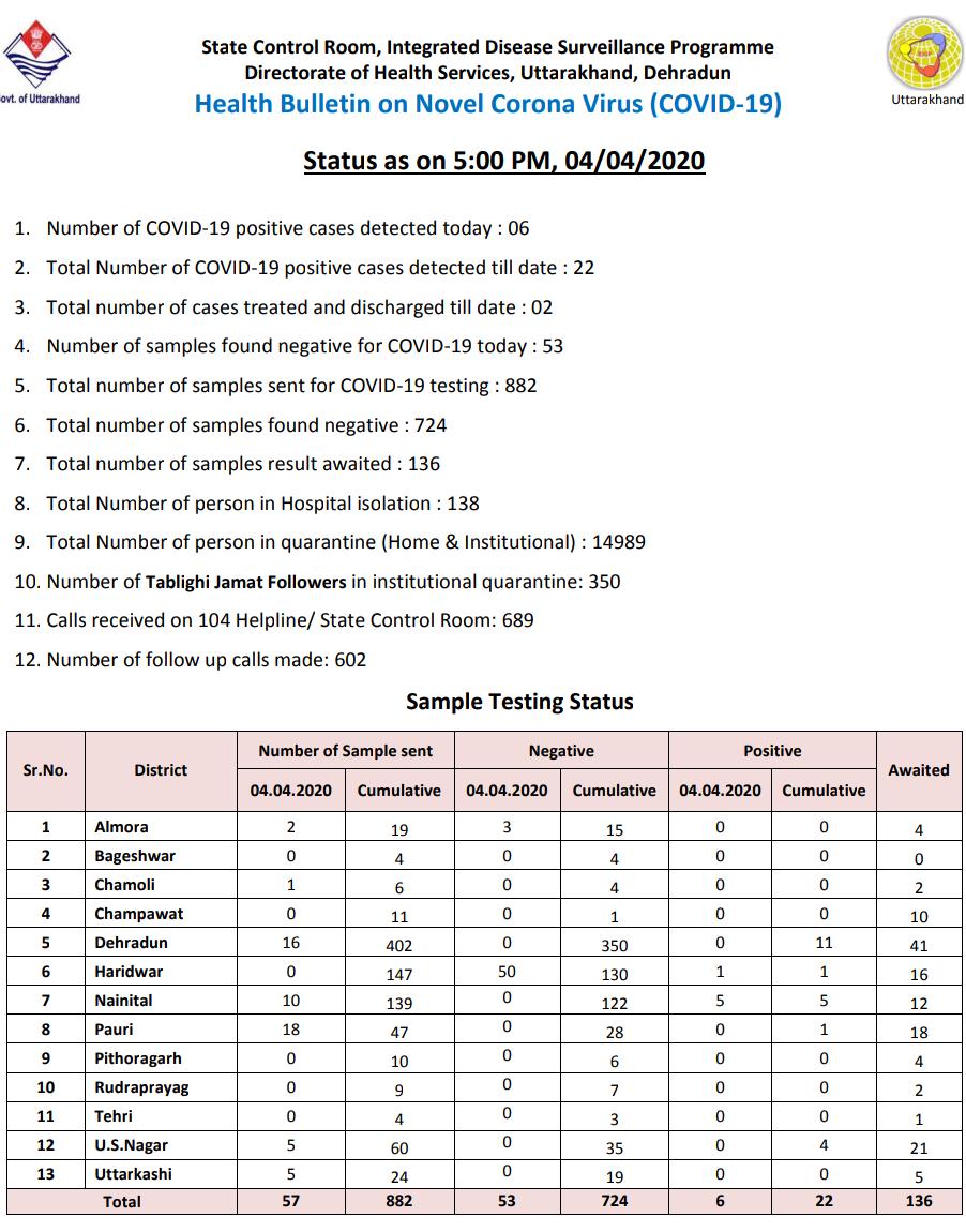 जनपद हरिद्वार में भी कोरोना मरीज पॉजिटिव का पहला मामला सामने आया है। शेेष 5 नैनीताल से हैं।