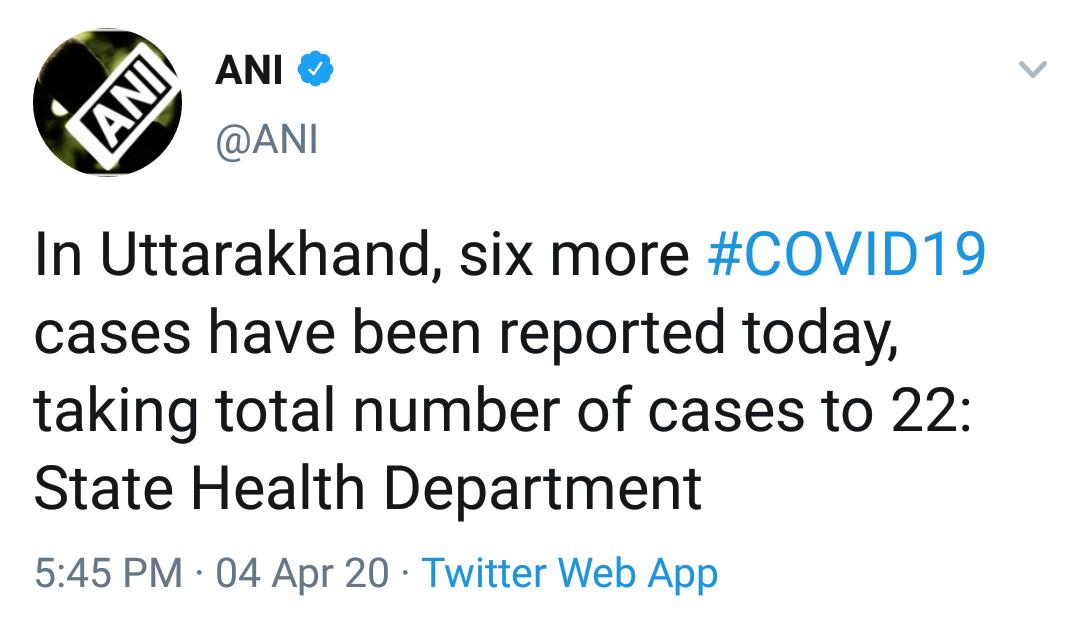 देहरादून।उत्तराखंड राज्य में आज छह और कोरोना मरीज पॉजिटिव मिले हैं। राज्य में अब कोरोना पॉजिटिव मरीजो की संख्या 22 हो गई है।