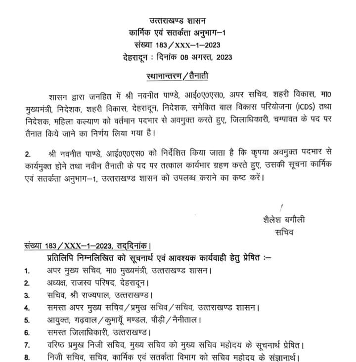 शासन द्वारा जनहित में नवनीत पाण्डे, आई०ए०एस०, अपर सचिव शहरी विकास, मा० मुख्यमंत्री, निदेशक, शहरी विकास, देहरादून, निदेशक, समेकित बाल विकास परियोजना (ICDS) तथा निदेशक, महिला कल्याण को वर्तमान पदभार से अवमुक्त करते हुए, जिलाधिकारी, चम्पावत के पद पर तैनात किये जाने का निर्णय लिया गया है।